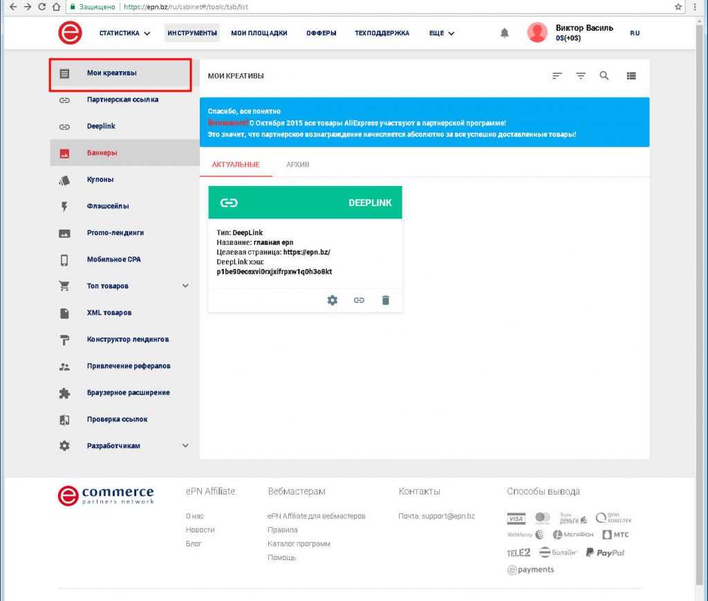 «Мои креативы» — здесь будут находится все ваши партнерские ссылки, диплинки, баннеры.