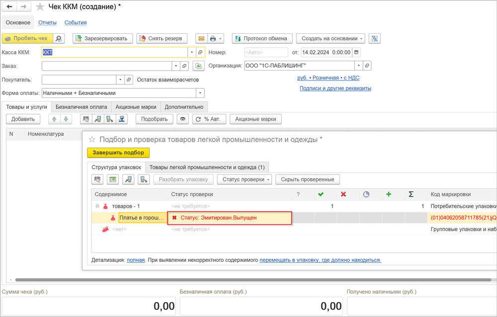 После включения проверки код маркировки будет добавляться в форму подбора только после успешного прохождения проверки. А в случае отрицательного результата проверки в графе «Статус проверки» будет выводиться сообщение об ошибке.