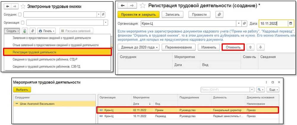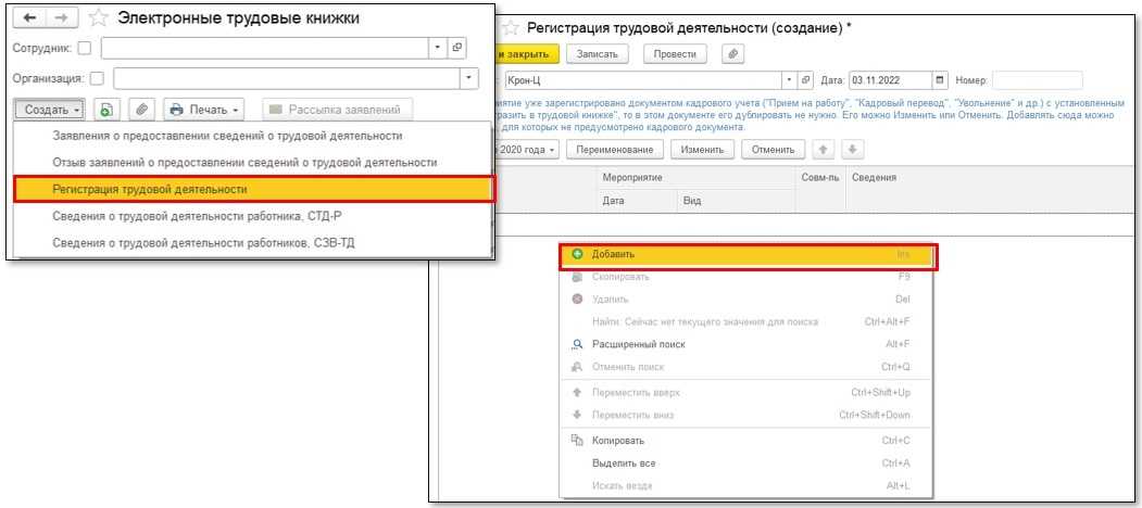 Исправить данную ошибку можно, сформировав СЗВ-ТД с помощью документа «Регистрация трудовой деятельности», для этого нужно: