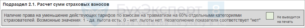 В разделе 2 теперь есть поле «Льгота». В нём ставят значок «Х» работодатели, которые платят страховые взносы от несчастных случаев в размере 60% от своего тарифа.