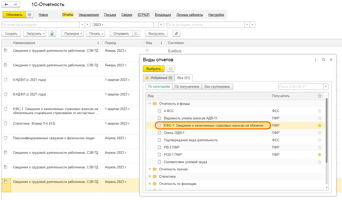 Для составления отчета необходимо в рабочем месте 1С-Отчетность ввести команду для создания нового экземпляра отчета по кнопке Создать и выбрать в списке доступных отчетов отчет с названием ЕФС-1 по кнопке Выбрать.