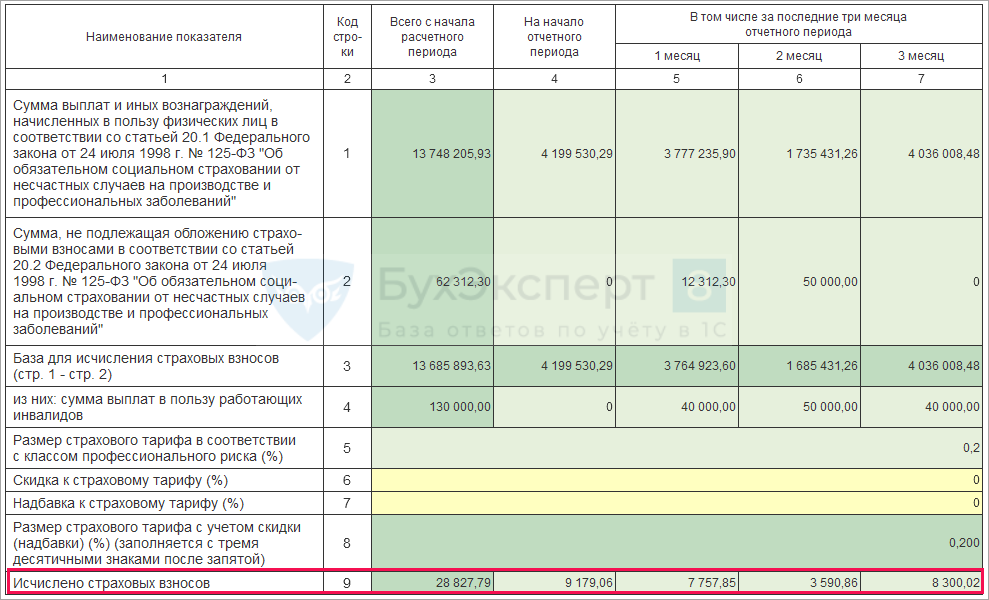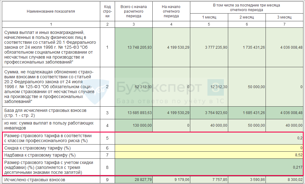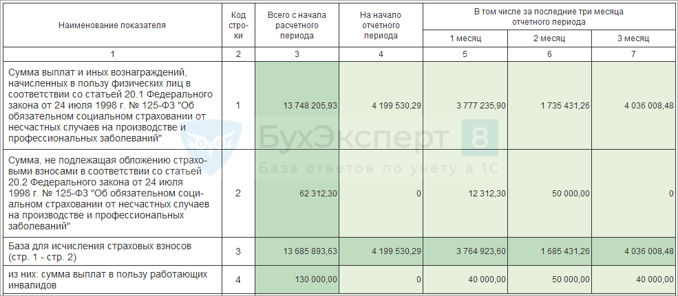 В этом подразделе содержатся общие суммы выплат по сотрудникам, необлагаемые выплаты, применяемый размер тарифа, а также исчисленные суммы «несчастных» взносов.