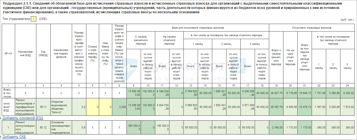 Подраздел 2.1.1 заполняют не все плательщики взносов, а лишь организации с выделенными самостоятельными классификационными единицами (СКЕ), некоторые государственные учреждения, а также страхователи, которые начисляют взносы по нескольким основаниям. Подробно об этом модуле сказано в разделе XI Порядка заполнения.
