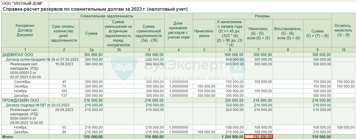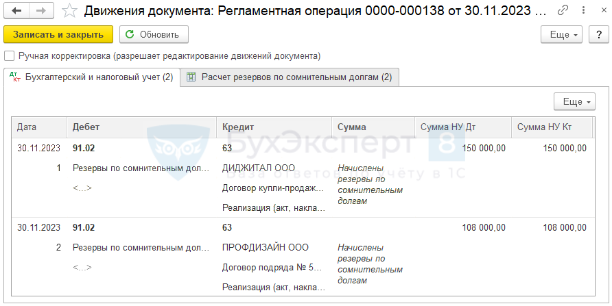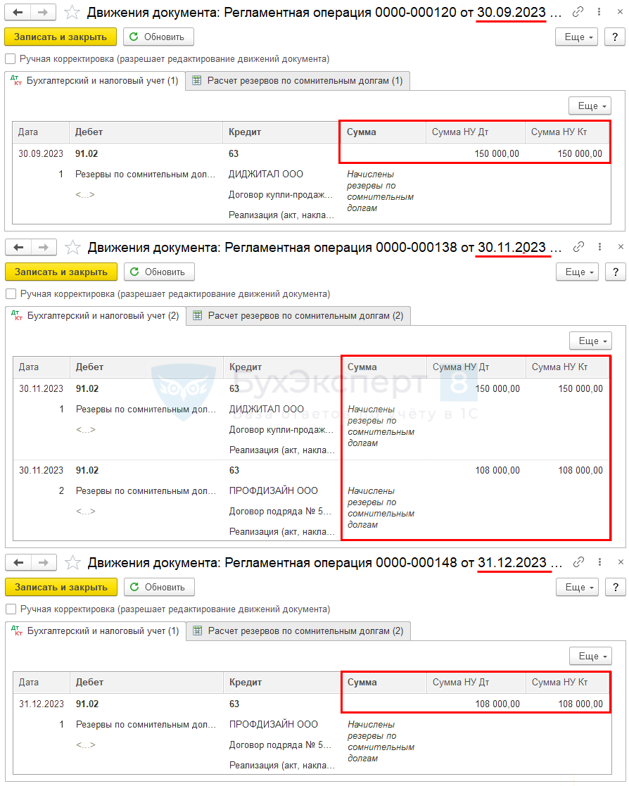 Именно на эти суммы сформированы проводки Дт 91.02 Кт 63 в регламентной операции Расчет резервов по сомнительным долгам.