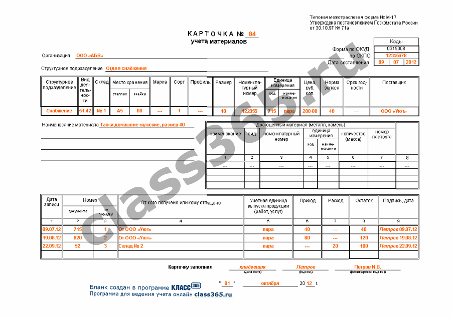 Ответственным за оформление карточки учета материалов обычно назначается работник склада. При поступлении материальных ценностей на склад материально-ответственное лицо заводит на них карточку по форме М-17 и в дальнейшем в этом бланке отмечается отпуск ценностей со склада, а также поступления. На каждый отдельный сорт, вид, размер материальных ценностей заводится отдельная складская карточка М-17.