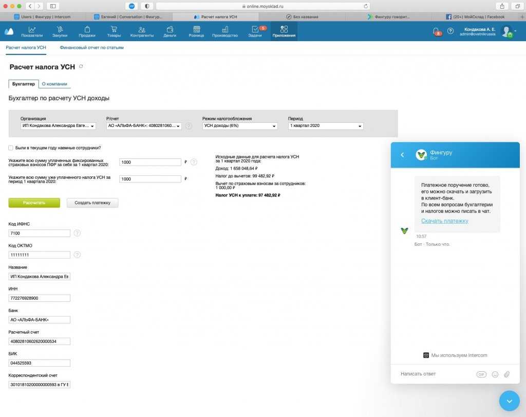 - на базе данных из МоегоСклада автоматически рассчитывается доход, а на его основании — сумма налога;