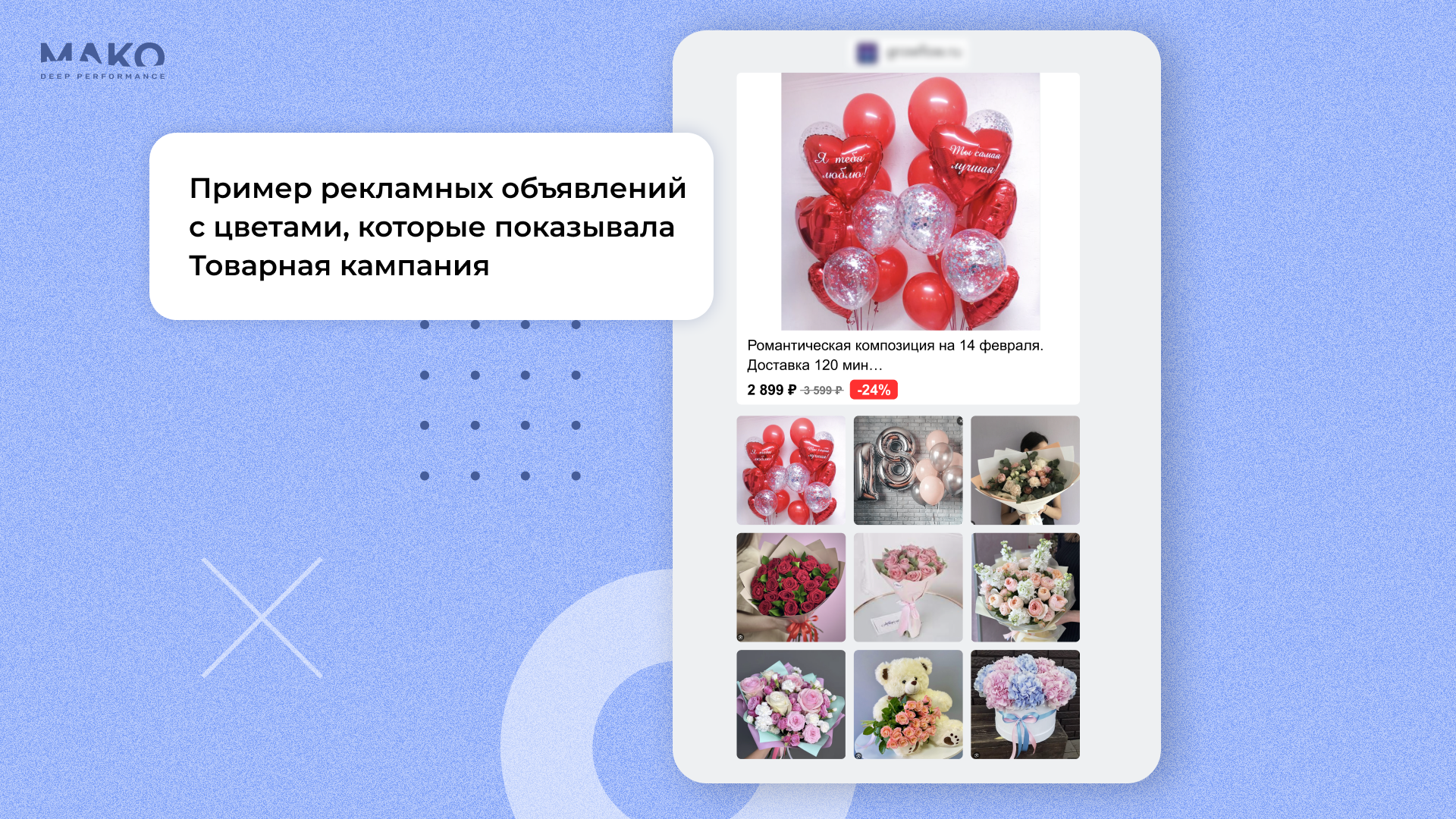 Причина была в том, что ко Дню влюбленных цветы пользуются большим спросом. ИИ Товарной кампании оценил разницу в популярности товаров (цветы/шарики) и выбрал сегмент цветов как приоритетный. Пришлось нам исключить 30 карточек цветов из фида и отключить отдельную кампанию по ним.