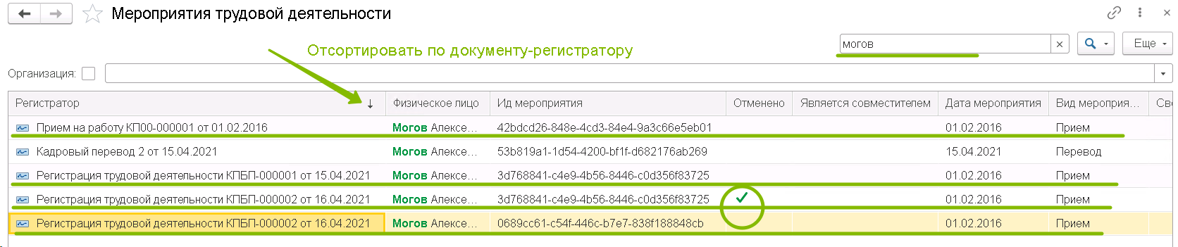 В данном регистре введите отбор по фамилии сотрудника, и вы сразу увидите список документов, которые являются основаниями для формирования СЗВ-ТД по тем или иным основаниям. Сразу отсортируйте список по самой первой колонке – документу-регистратору. В данном примере мы видим, что основаниями для отправки информации по документу Прием в системе являются четыре документа: собственно документ приема и два документа Регистрация трудовой деятельности. Первый из них также несет информацию о кадровом мероприятии Прием (Данные до 2020 г.), а второй является изменяющим – в нем мы изменяли информацию о номере приказа. И это видно, так как в одной записи есть маркер отмены.