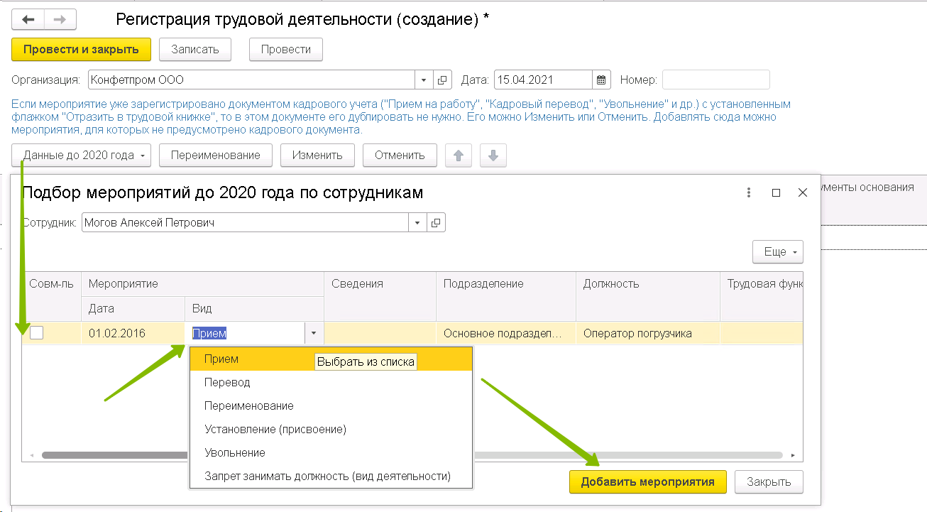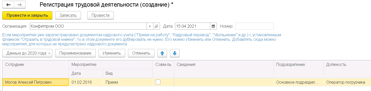В документе есть кнопка Данные до 2020 г. с помощью которой можно вносить информацию о кадровых мероприятиях до 2020 г., поэтому созданное таким образом мероприятие также попадет в отчет СЗВ-ТД. Также, этот способ годится для внесения мероприятий, которые отсутствуют в виде кадровых документов в 1С:Бухгалтерия.
