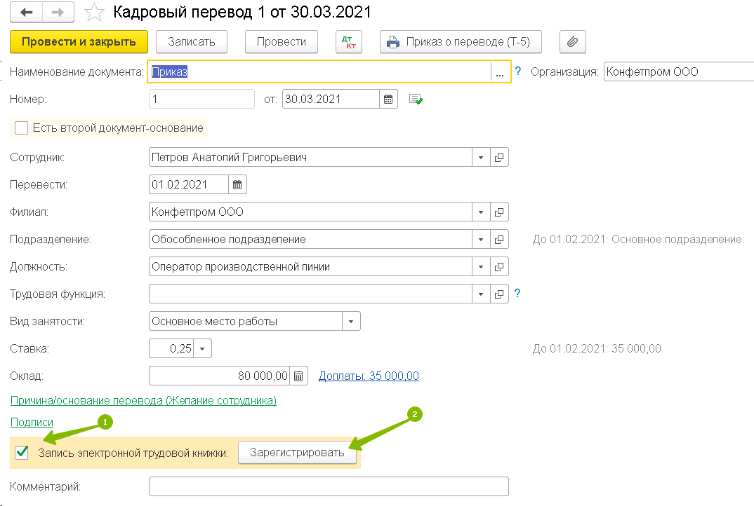 В каждом кадровом документе у вас есть флаг Запись электронной трудовой книжки (1). Именно наличие этого флага определяет, попадет ли данный кадровый документ в заполнение очередного отчета СЗВ-ТД или нет. Этот флаг не относится к выбранному сотрудником способу ведения трудовой книжки. Рядом с этим флагом есть кнопка Зарегистрировать (2). Ей вы можете воспользоваться, чтобы сразу же создать отчет СЗВ-ТД на основании данного документа.