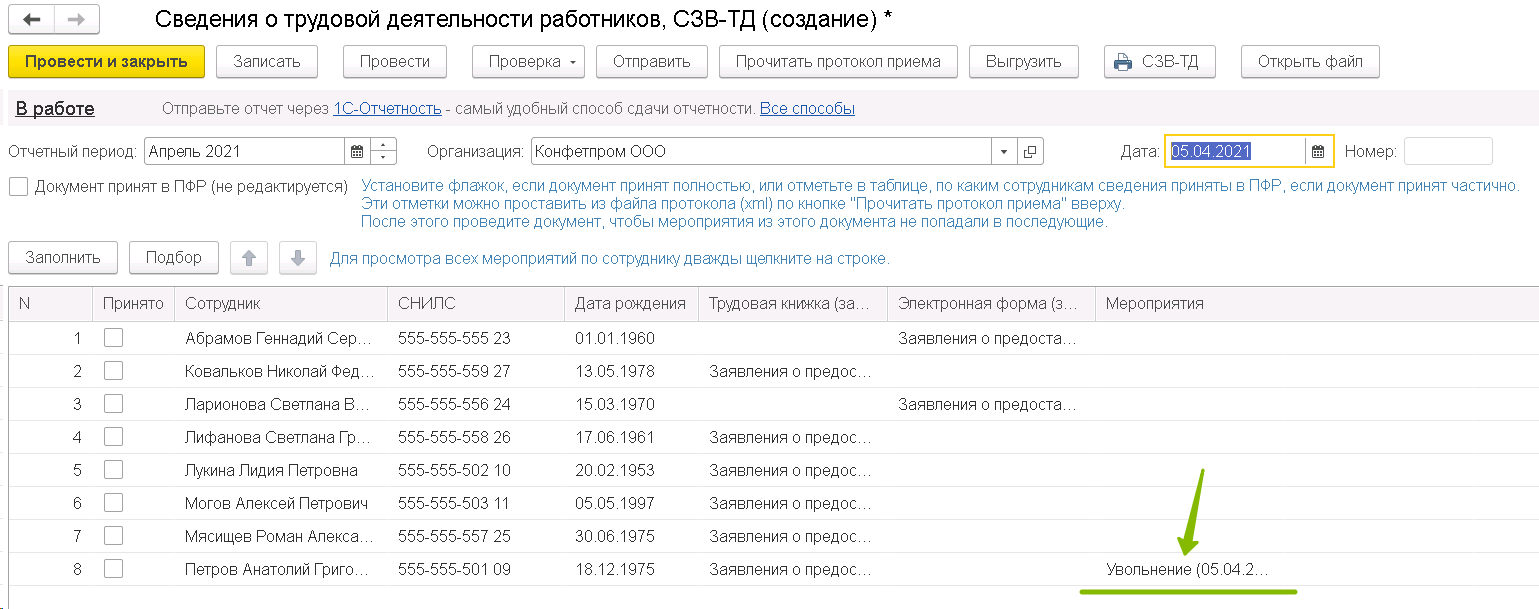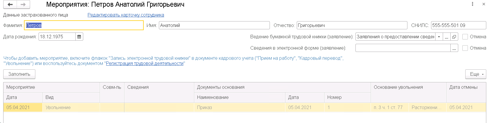 Например, мы заполняем отчет СЗВ-ТД, куда подтягиваем информация о выборе способа ведения трудовых книжек по сотрудникам и видим, что туда же вкралось мероприятие Увольнение по Петрову, которое мы уже сдавали.