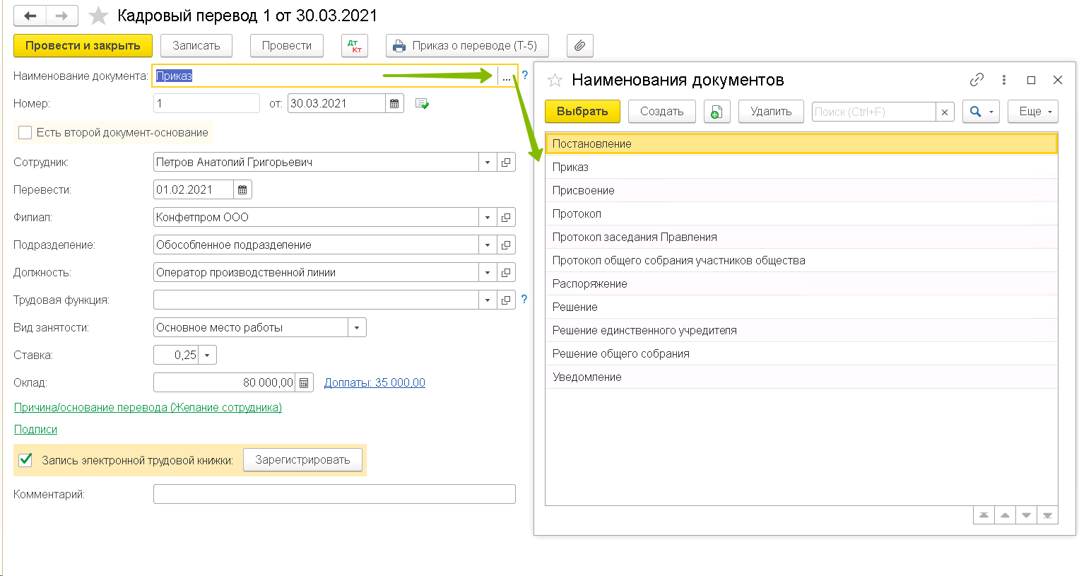Сохраняем изменения и выбираем в кадровом документе данную трудовую функцию.
