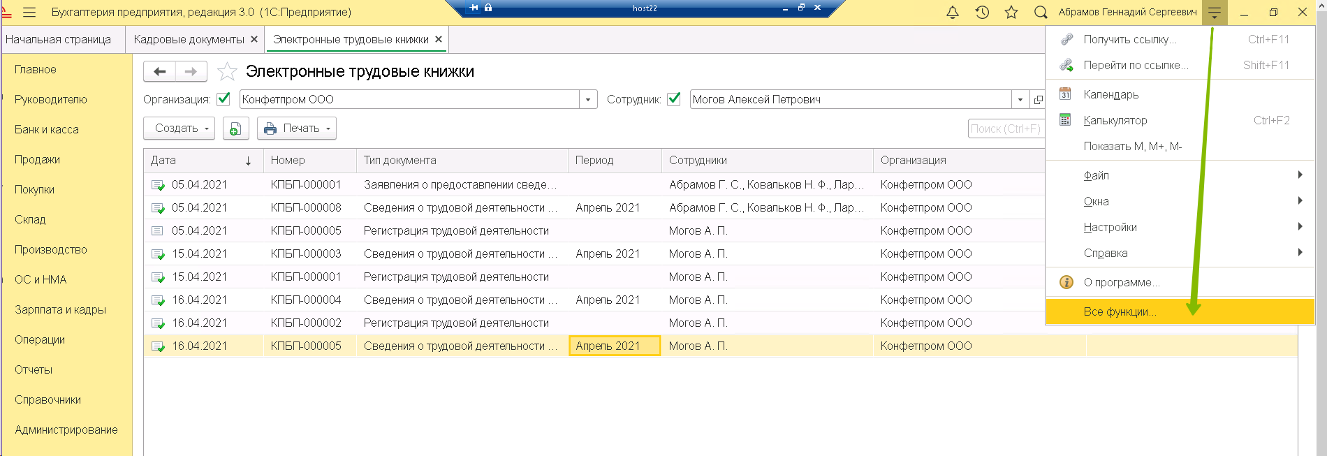 Быстрее и прощевсего отследить, каким документами вызвана необходимость изменений в отчете СЗВ-ТД по регистру сведений Мероприятия трудовой деятельности, открыв его через Все функции. (Чтобы активировать саму строчку в меню, зайдите в Меню – Настройки – Параметры – и активируйте самый нижний флаг.
