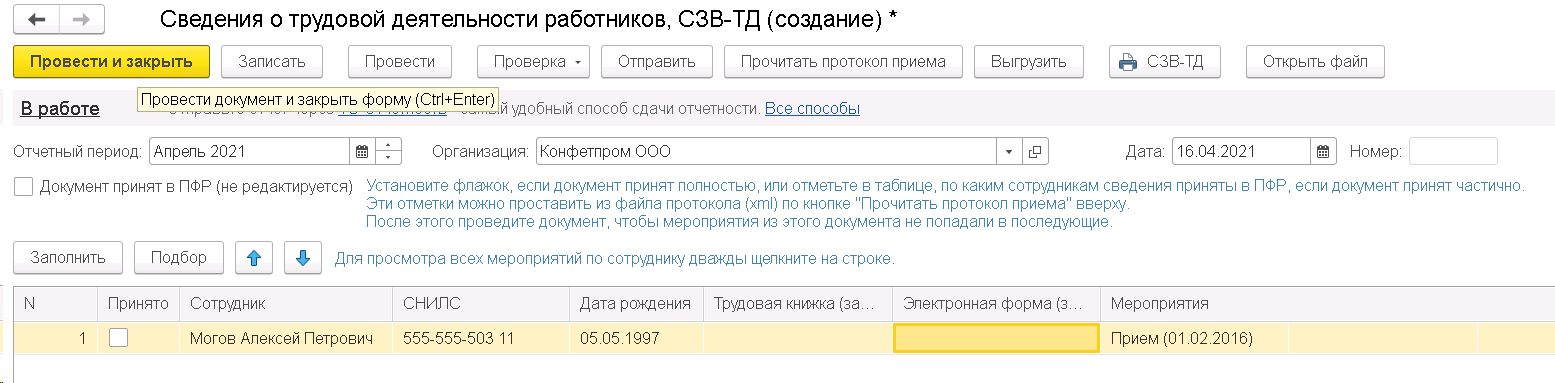 Так, внесем по сотруднику Могов данные о приеме на работу в 2016 г. Создадим сначала документ Регистрация трудовой деятельности, затем отчет СЗВ-ТД на его основании.