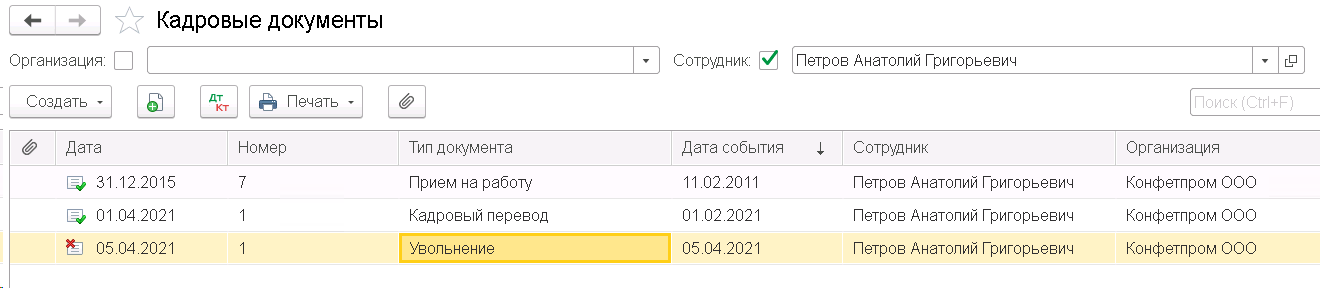 В расшифровке мы видим, что событие серое, т.е. имеет признак отмены. Для того, чтобы понять основания для этого откроем кадровые документы с отбором по Петрову.