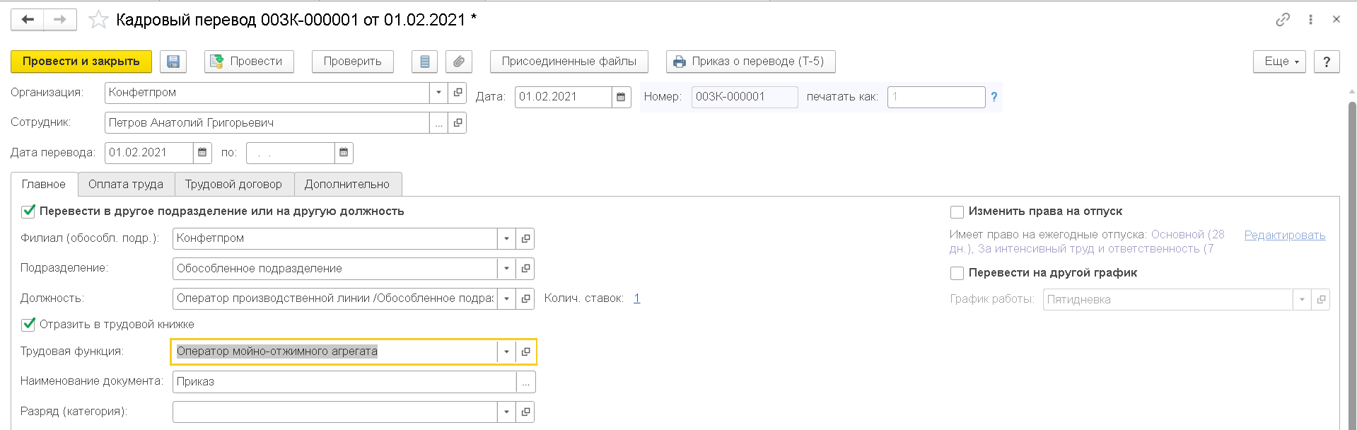 Сохраняем изменения и выбираем в кадровом документе данную трудовую функцию.