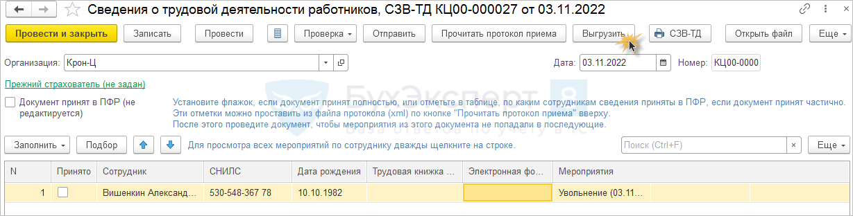 Выгрузим файл документа СЗВ-ТД по команде Выгрузить.