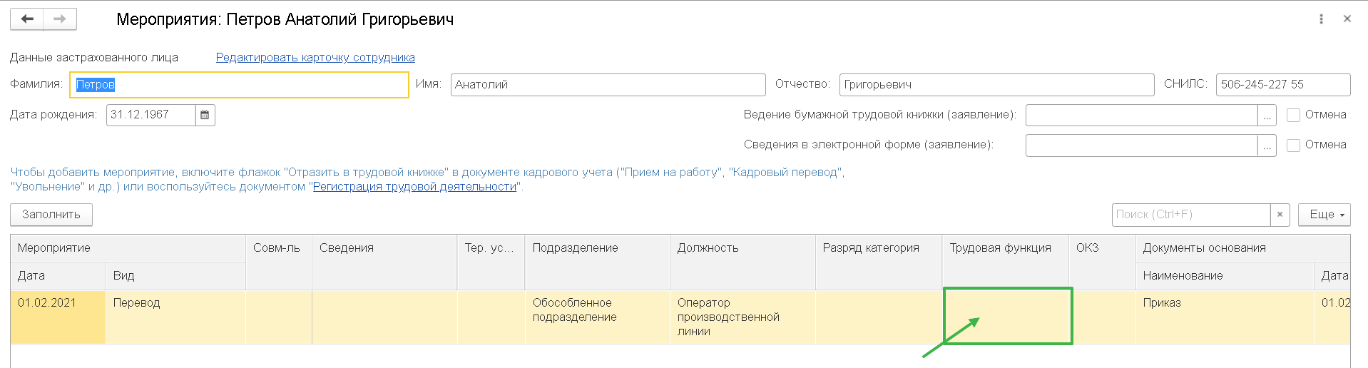 Если в расшифровке мероприятия СЗВ-ТД, подаваемого с начала июля 2021, у вас трудовая функция не указана, вам необходимо будет: зайти в документ, регистрирующий данное мероприятие (в примере – Кадровый перевод), провалиться в поле Трудовая функция, создать нужную запись трудовой функции с кодом, полученным из ОКЗ, провести документ, после чего вернуться к СЗВ-ТД и перезаполнить его. В идеале – указать предварительно трудовую функцию в позиции Штатного расписания. Тогда она выберется автоматически при формировании кадрового документа.