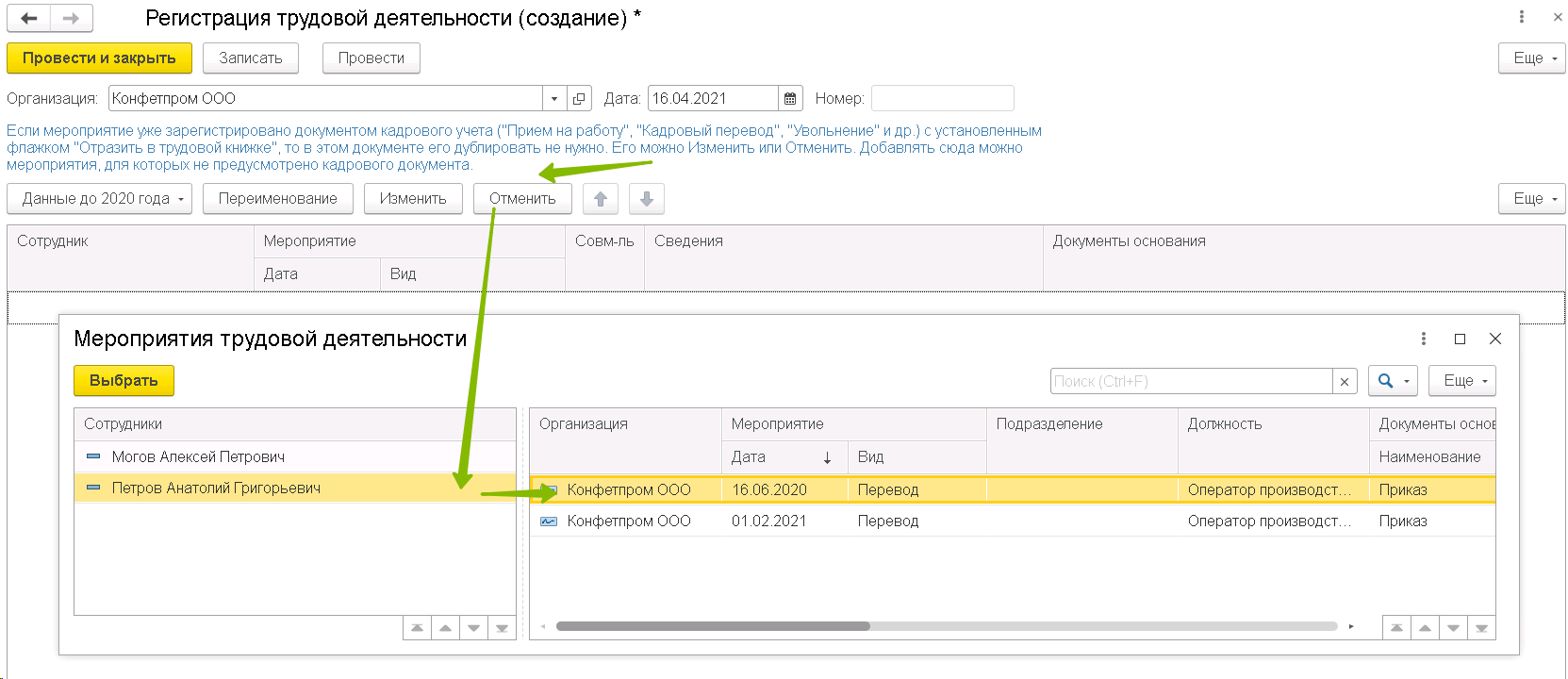Создаем такой же документ Регистрация трудовой деятельности и в нем нажимаем Отменить, выбираем сотрудника и событие, которое требуется отменить.