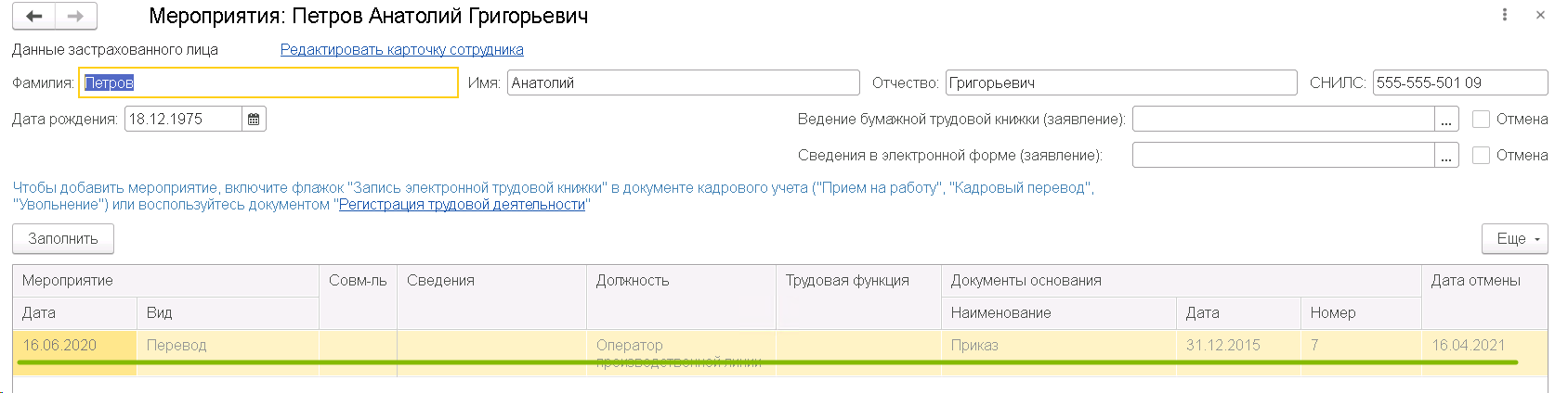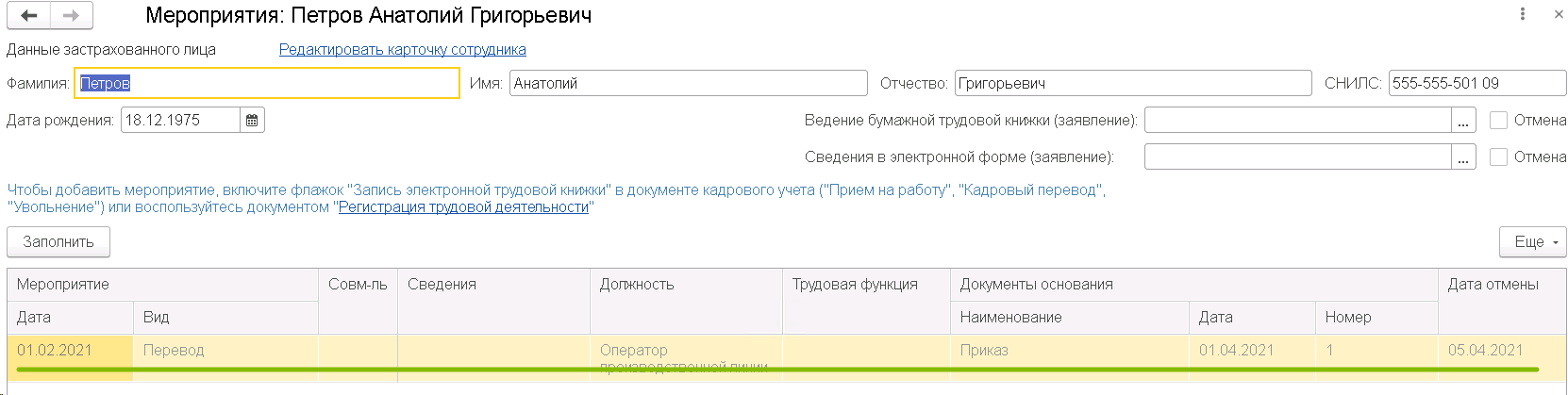 По сотруднику Петров с помощью документа Регистрация трудовой деятельности ошибочно было подано мероприятие Кадровый перевод (до 2020 г.) и требуется его отмена для ПФР.