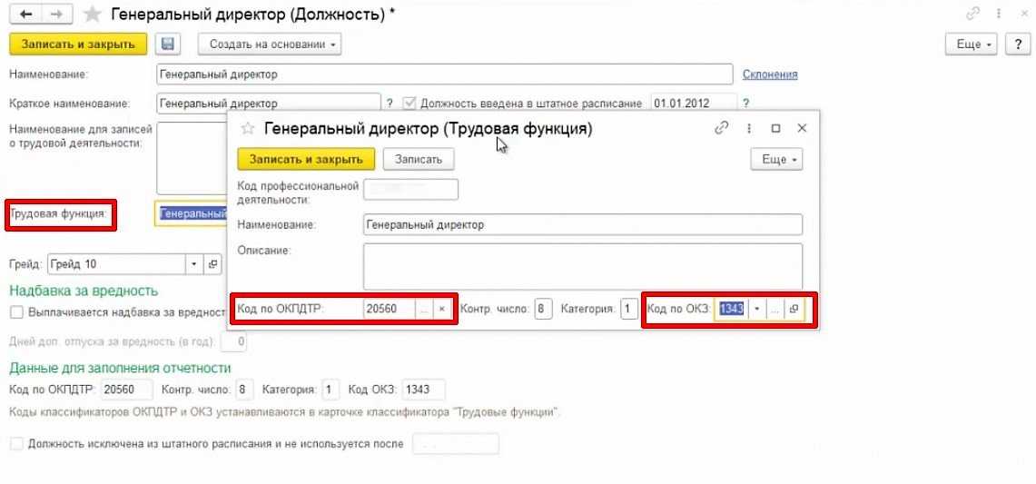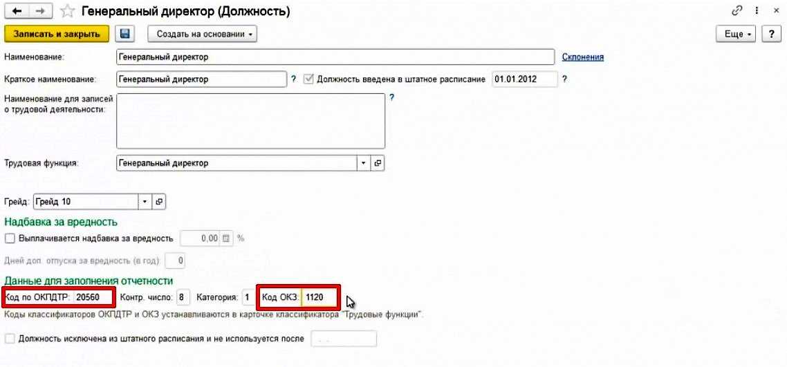 В самой карточке по конкретной должности кодировки занятий и ОКПДТР показывают как данные для заполнения отчетности. Теперь это служебные реквизиты, их нельзя редактировать.