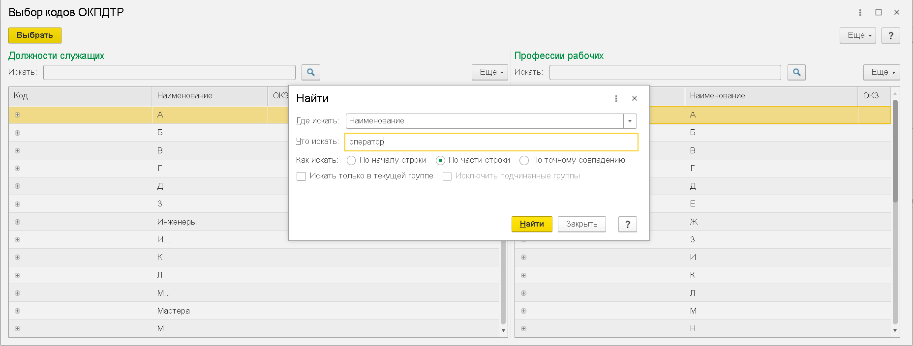 Как видно, коды сгруппированы не всегда понятно, если смотреть с точки зрения занимаемой должности или отталкиваться от сферы деятельности компании. Давайте разберёмся, какие подходы использовать для поиска.