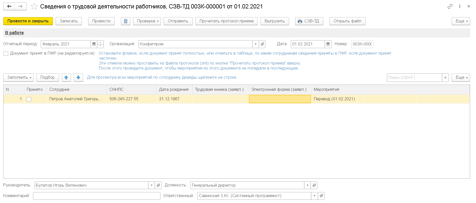 - Поправить в тексте файла выгрузки непосредственно в документе СЗВ-ТД в ЗУП 3.1 — это удобно, если СЗВ-ТД отправляется напрямую из ЗУП 3.1.
