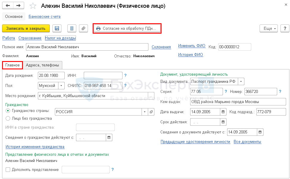 В обязательном порядке следует получить разрешение работника на хранение и обработку его персональных данных (пп. 1 п. 1 ст. 6 Федерального закона от 27.07.2006 N 152-ФЗ). Для этого по кнопке Согласие на обработку ПДн нужно создать, распечатать и подать ему на подпись Согласие на обработку персональных данных. PDF
