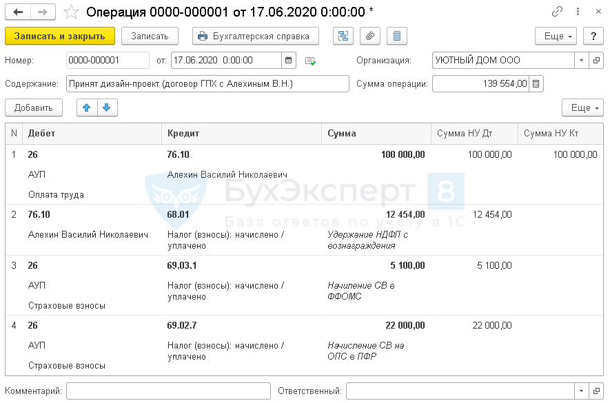 Для каждого из договоров учет вознаграждения за произведенные работы (оказанные услуги) будет иметь особенности. Мы рассмотрим пример договора с физическим лицом, который не является предпринимателем и не состоит в штате организации-заказчика.