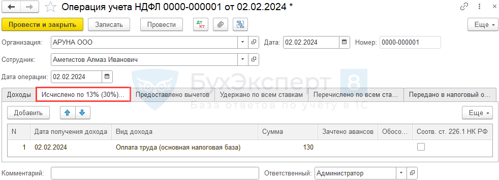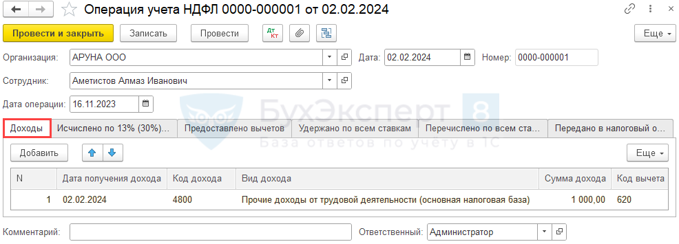 Отразите доход по НДФЛ в документе Операция учета НДФЛ (Зарплата и кадры — НДФЛ — Все документы по НДФЛ):