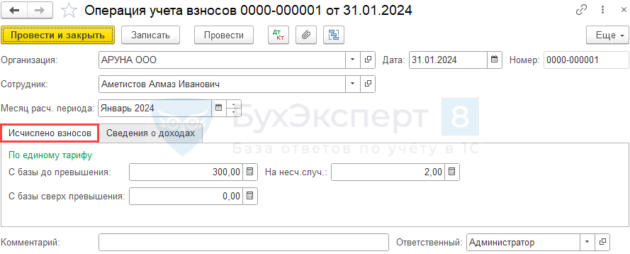 Заполните документ Операция учета взносов: