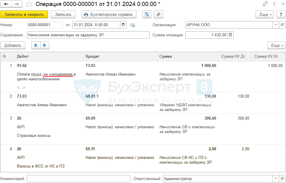 - Субконто 1 — сотрудник, которому начислена компенсация;