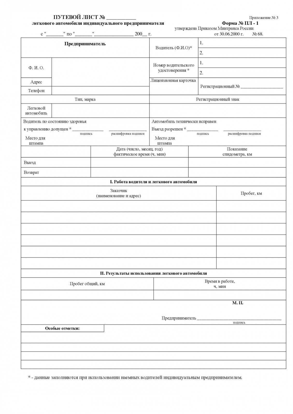 Если же легковой автомобиль находится в собственности индивидуального предпринимателя, и он сам или его сотрудник совершают служебную поездку, форма несколько меняется. Здесь, в частности, включается поле для подписи медработника, который совершил осмотр и разрешил выход водителя в линию.
