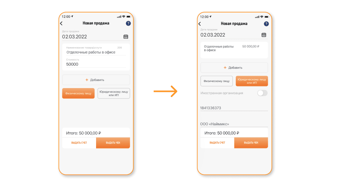 2) Заполните необходимые поля: дата оплаты, название товара (услуги), стоимость и статус заказчика (физлицо, юрлицо или ИП). Опишите название услуги как можно подробнее. Если услуг или товаров несколько, их можно добавить в этот же чек. Для этого нажмите на кнопку «Добавить» и заполните соответствующие поля. Если организация или ИП запрашивают у вас счет на оплату, нажмите «Выдать счет».