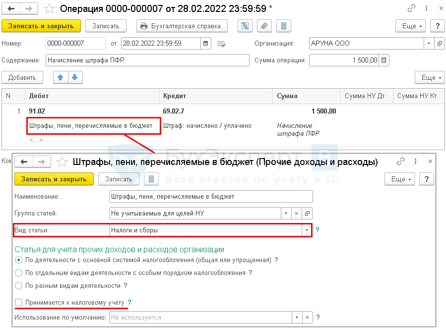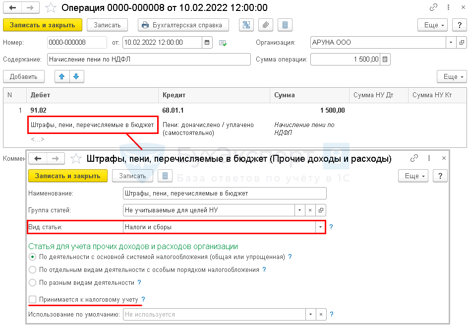 Обратите внимание на выбор статьи – Штрафы, пени, перечисляемые в бюджет и на заполнение аналитики по ней. Проверьте и повторите эти настройки в своей базе