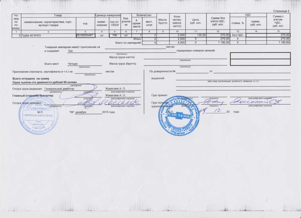 Образец заполнения товарной накладной страница №2