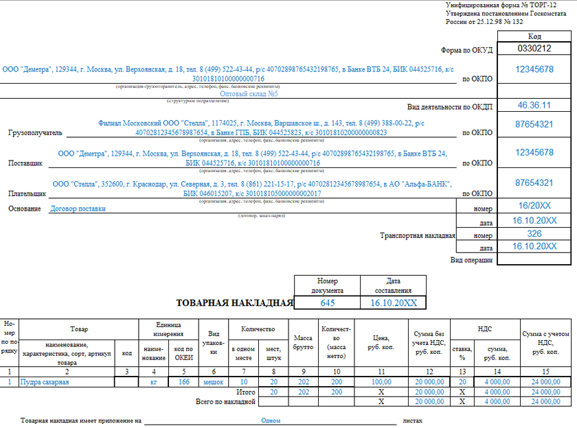 ТОРГ-12 — товарная накладная применяется при оформлении продажи товаров или иных материальных ценностей посторонней организации. Унифицированная форма товарной накладной ТОРГ-12 — образец заполнения можно скачать в статье — утверждена постановлением Госкомстата от 25.12.1998 № 132.