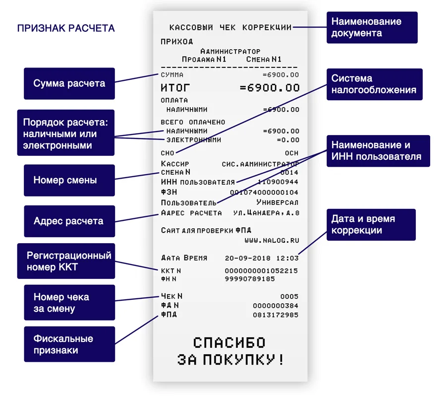 Чек коррекции должен содержать реквизиты, перечисленные в п. 5 ст. 4.1 Закона № 54-ФЗ.