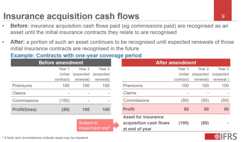 Еще один важный “расчетный” аспект, который иллюстрируется на примере — как было до недавнего времени, и как стало, начиная с июня. IFRS 17 требует от организаций учитывать расходы на заключение договоров страхования (уплаченные комиссии), потому что они нужны для расчета контрактной маржи CSM и рассматриваются как часть денежных потоков на исполнение контракта. С практической точки зрения расходы признаются как активы до момента первоначального признания группы страховых контрактов, к которым они относятся. Подробнее обо всем этом рассказывалось по ходу третьего вебинара, который вышел в ноябре 2017 года, но одну важную и проблемную ситуацию он все же проигнорировал, из-за чего пришлось вносить коррективы.