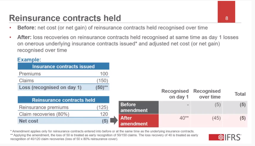 Стандарт IFRS 17 требует немедленного признания любых потерь при первоначальном признании выпущенного страхового контракта через прибыли или убытки (P&L). Однако все это время до внесения изменений чистые потери (или чистые доходы) по сделке приобретения договора перестрахования признавались в течение периода времени, а немедленно — в момент первоначального признания — не признавалось ничего. В результате получалось расхождение в учете, понятное даже из соображений простой логики: с одной стороны, мы немедленно признаем потери по обременительным страховым контрактам, с другой — почему-то постепенно признаем возмещение этих потерь через договор перестрахования, купленный на этот страховой контракт.