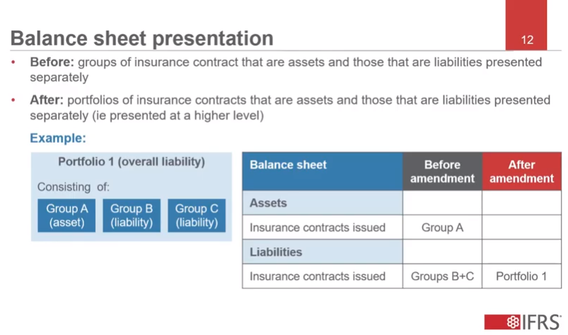 Речь, разумеется, идет о группировке договоров страхования, как ее оговаривает сам стандарт. Теме агрегирования договоров страхования также был посвящен один из вебинаров (у нас он, впрочем, в двух частях). Ключевое изменение — требование о раздельном представлении страховых договоров, относящихся к активам, и страховых договоров, относящихся к обязательствам, по портфелям, а не группам. Портфели — более широкая категория, которая может включать несколько групп – причем даже необязательно, чтобы все они были исключительно договорами категории активов или договорами категории обязательств. По статистике, впрочем, большая часть групп будет относиться скорее к обязательствам, и тогда весь портфель также будет рассматриваться как портфель обязательств, но бывают и портфели активов. Как следствие, это изменение стало существенным упрощением работы, которую компании вынуждены выполнять в ходе подготовки отчетности по страховой деятельности.