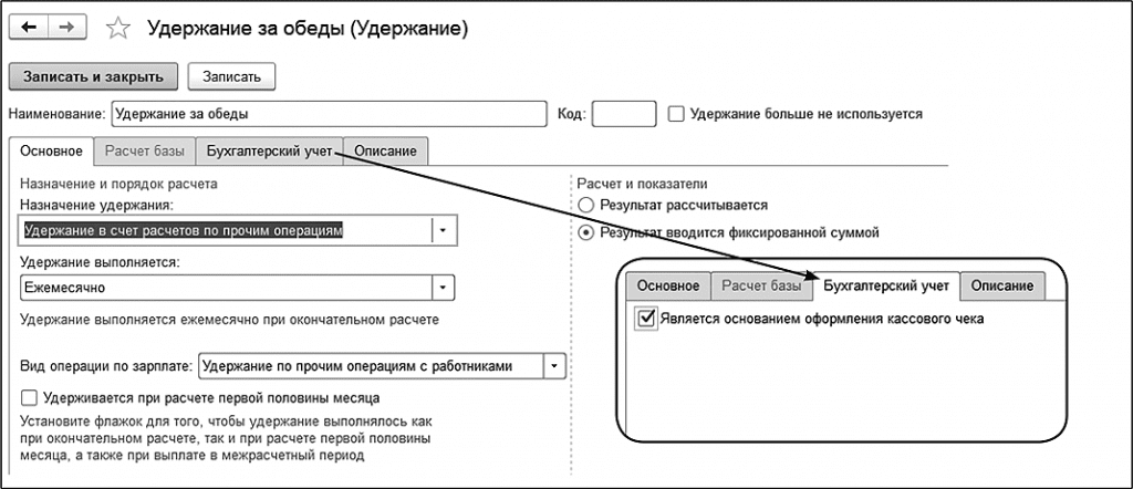 В программе «1С:Зарплата и управление персоналом 8» редакции 3 настроено «Удержание за обеды» с установленным флагом Является основанием оформления кассового чека (рис. 1).