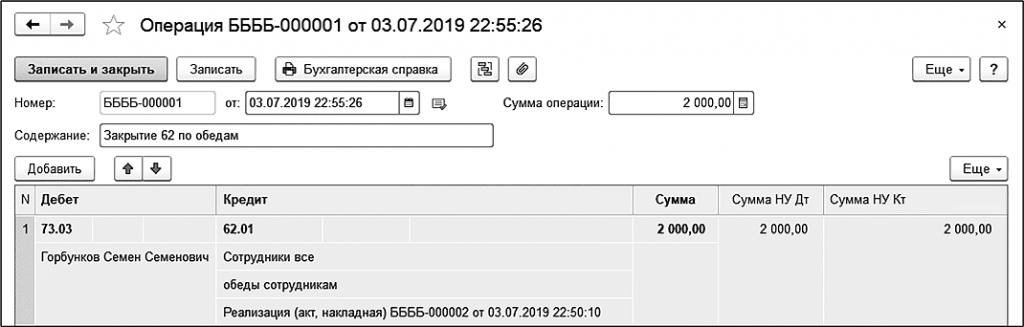 Взаиморасчеты (счет 62 «Расчеты с покупателями и заказчиками» и 73 «Расчеты с персоналом по прочим операциям») закрываются Операцией, введенной вручную (рис. 7).