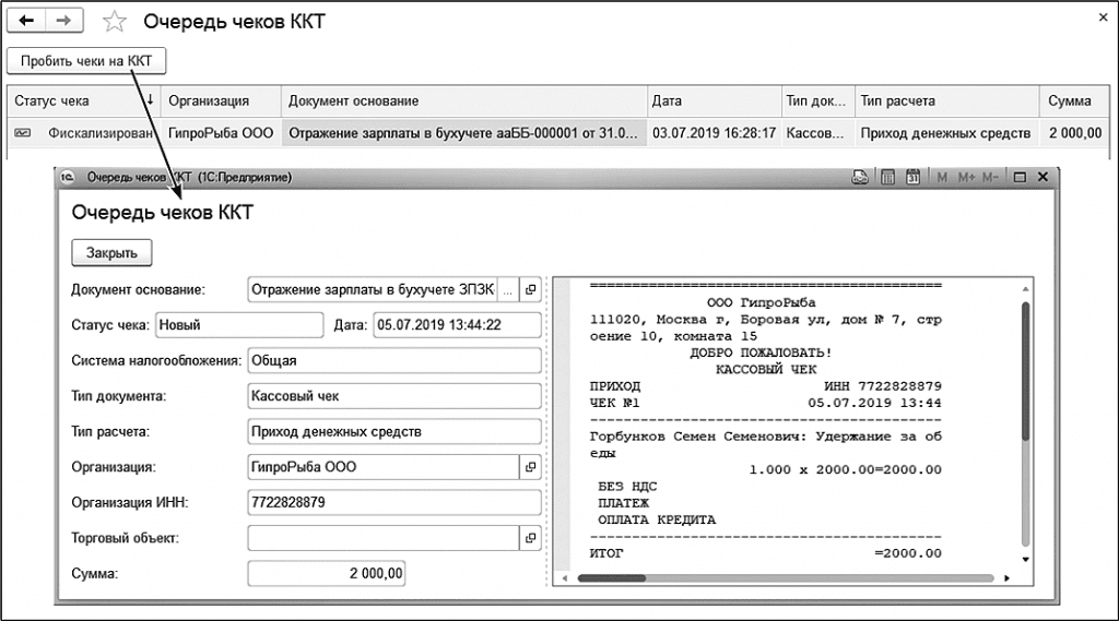 По нажатии кнопки Чек открывается окно Очередь чеков ККТ, где по кнопке Пробить чеки на ККТ фискализируется Приход денежных средств (рис. 5).