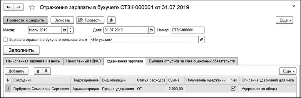 Поля Чек и Описание удержания для чека заполняются в документе автоматически.