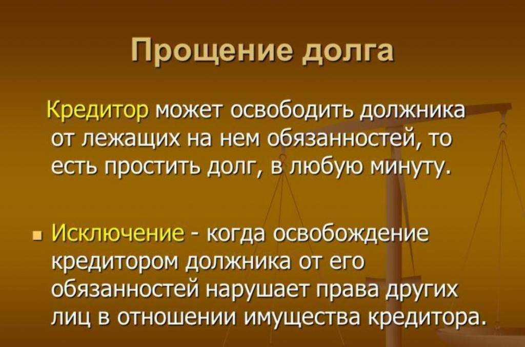 Законом регламентируется, что прощение долга, как и любая другая форма дарения, может осуществляться исключительно в безвозмездном виде. Держатель долга не приобретает никакой материальной выгоды, должник не облагаем никакими обязательствами. Однако соглашение о прощении долга лишает кредитора какой-либо возможности предъявить требования должнику на выполнение изначальных обязательств, установленных при соглашении, в том числе требовать этого в суде. Исключением может считаться принятие подобного договора ничтожным на десять лет с момента подписания.