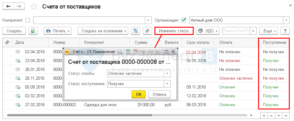 По счетам, по которым прошло поступление ТМЦ, работ (услуг), но не указанным в документах поступления, измените Статус поступления вручную в журнале Счета от поставщиков по кнопке Изменить статус.