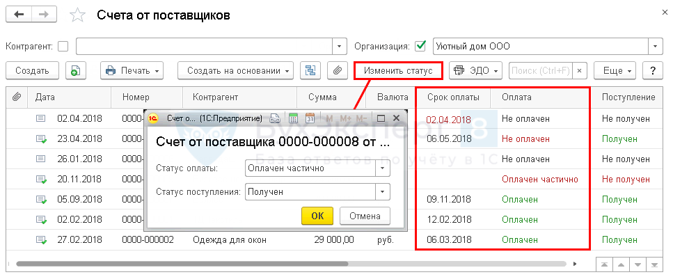 Если счет оплачен, но он не указан в документе оплаты (Статус оплаты автоматически не изменен), измените его вручную в журнале Счета от поставщиков по кнопке Изменить статус или непосредственно в самом документе в поле Статус оплаты.