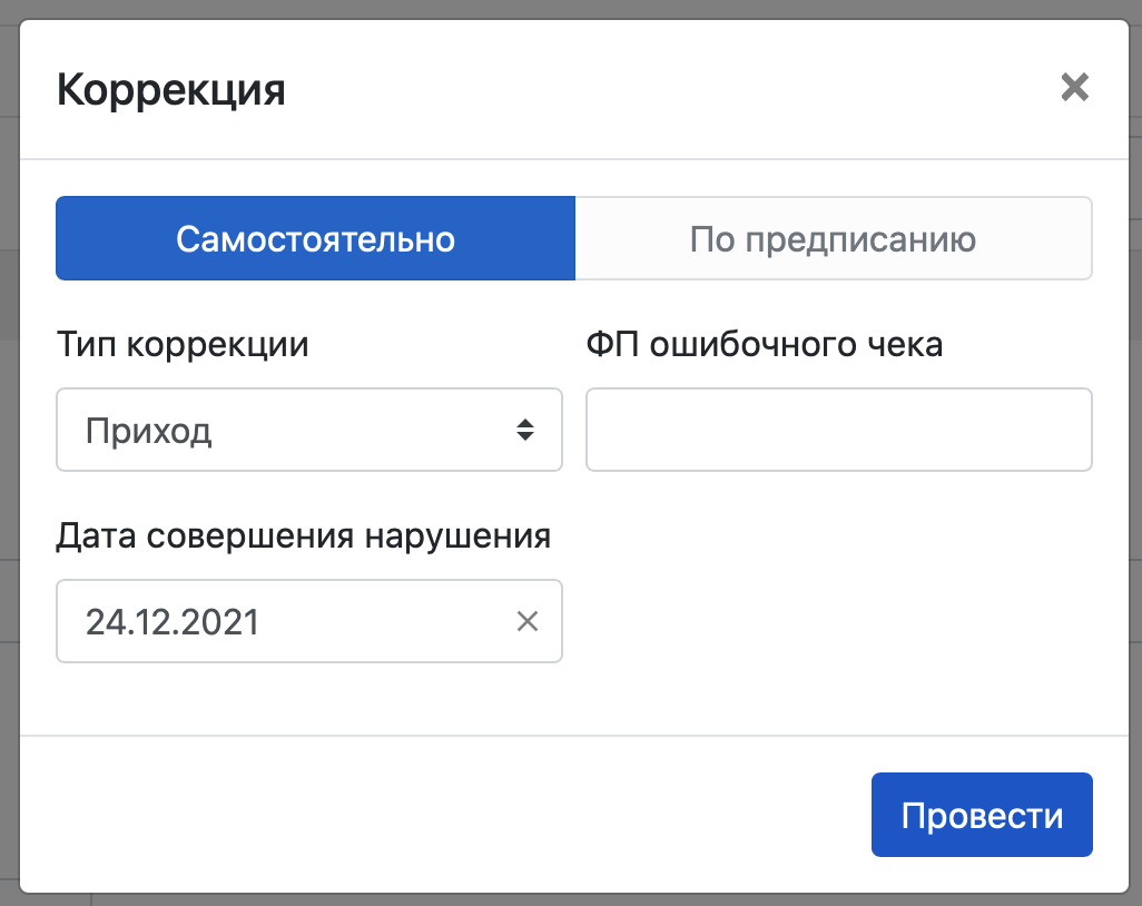 Тип коррекции (1173): если ошибку обнаружил кассир, то «0» или «Самостоятельная операция». Если первыми об ошибке узнали проверяющие из ФНС, то «1» или «По предписанию».