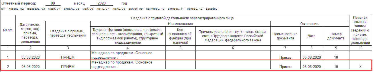 Например: в ранее сданном отчете ошибочно указана запись о приеме на работу.